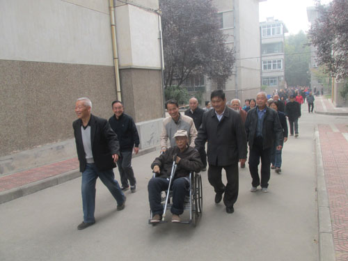队伍中,有4位坐着轮椅。其中,姚振镐老先生,是年龄最大的,已96岁高龄,他是被70岁的二儿子姚培鑫,推着“走”完了全程。86岁的王仁政,拄着拐杖,被55岁的女儿王慧琴,搀扶着行走在队伍中。还有一些体质比较差的,走了一会身上就冒汗,腿也发软,但看到头发花白,比自己大很多的长者,步伐矫健地走在前面,甩开膀子为大家开路,便鞭策自己,努力跟着队伍前进。
